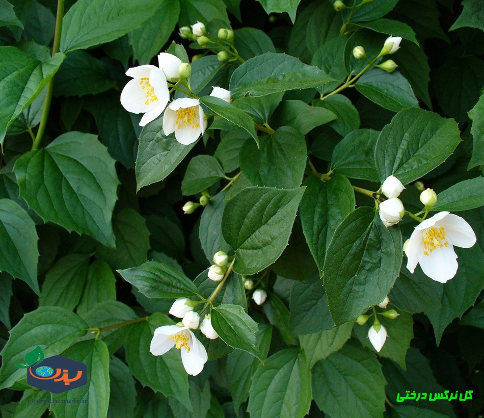 گل : گل های سفید معطر دارد که در ائاسط بهار تا اوایل بهار روی شاخه های جانبی و انتهایی می رویند